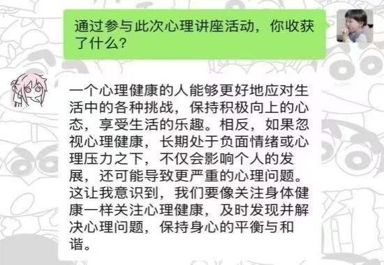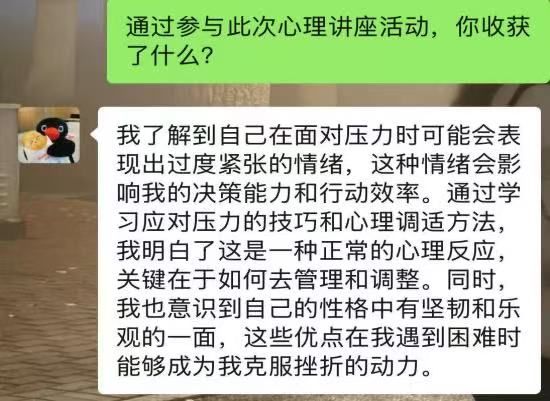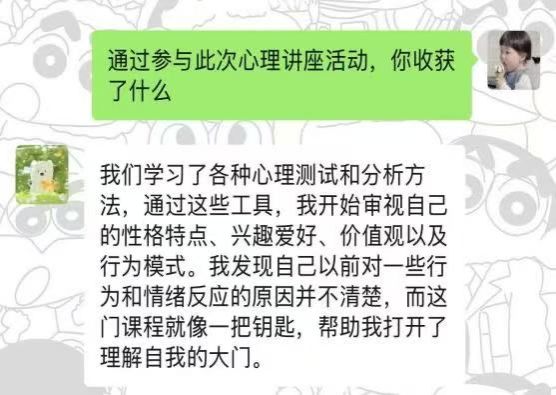 王英梅老师利用生动的漫画和古希腊哲学智慧开展讲解,指出认识并了解自我是人类思想和生命境界的核心追求,鼓励同学们建立稳健自我认知,摆脱负面情绪困扰,依循内心指引走自己的路。还强调大学是知识与思想交流平台,同学们在掌握专业知识时要培养洞察人心能力,学会倾听能深入理解他人、明晰看见自我,识人是对他人及自我性格情感的理解包容 。