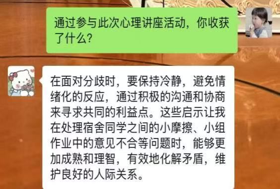 她分享孩子大学专业选择的例子,鼓励同学们追求自我成长,不被标签或他人定见限制,选适合自己的路,心怀爱意迎接情感碰撞 。讲座尾声邀请同学进行“自与我”互动表演,强调亲密关系中保持自我、倾听对方重要性,展示如何通过交流实现相互理解 。