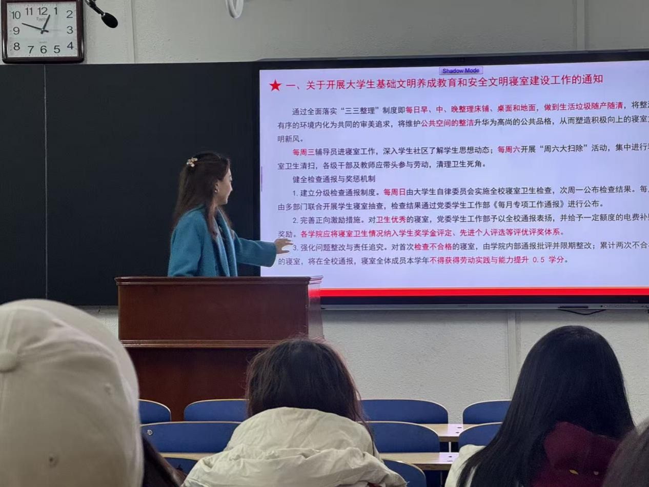 会议围绕基础文明养成教育、电动自行车管理、学风考风建设及违纪处分等多个方面展开,旨在进一步增强学生的纪律意识、安全意识和责任意识,营造文明有序、积极向上的校园氛围。会议伊始,辅导员老师详细解读了《关于开展大学生基础文明养成教育和安全文明寝室建设工作的通知》