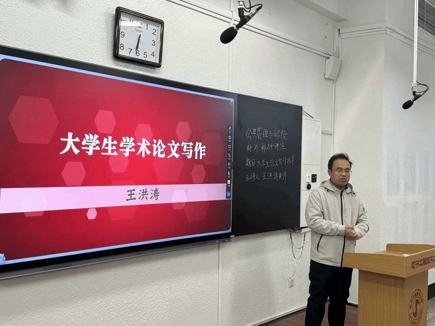 互动交流环节,同学们积极提问,有人问“普通大学生如何学习公共管理相关知识”,也有人关心“基层社区治理中遇到的难题该如何解决”。王洪涛教授耐心解答,鼓励大家多关注社会热点,多参与实践活动,从生活中感受公共管理的价值。