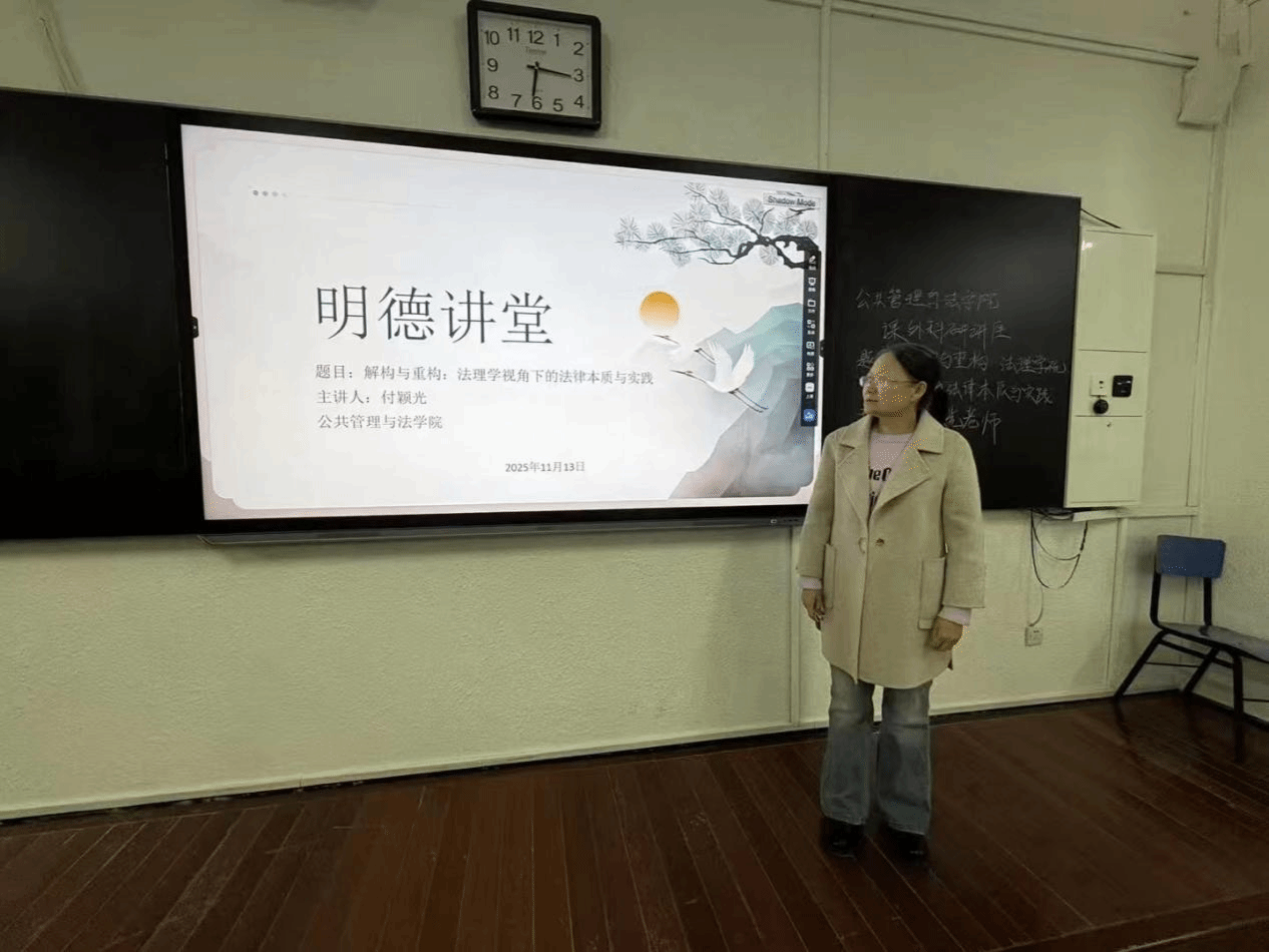 付颖光老师兼具扎实的理论功底与鲜活的授课风格,善于用通俗语言拆解抽象概念。讲座中,他以“解构法律本质”为切入点,系统阐释了法的起源、价值内核与社会功能,进而引导学生“重构”法律思维——跳出条文表面,从法理逻辑出发分析现实法律问题。结合热点案例,付老师深入剖析了法理在司法实践中的应用逻辑,强调“法理是法律的灵魂,唯有吃透本质,才能灵活适用法律”,为学生提供了兼具深度与实用性的思考路径。
