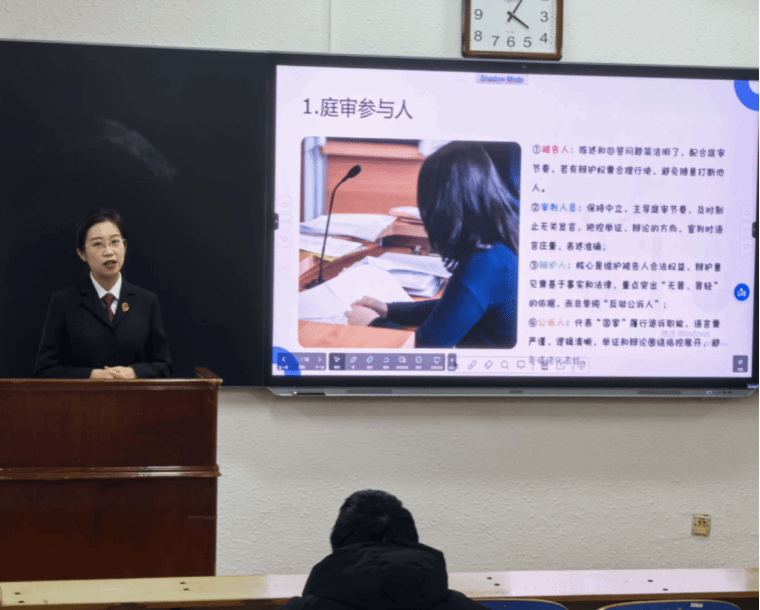 讲座中,卢珊检察官以清晰的逻辑、详实的案例,详细阐释“四大检察”职能体系,结合实务场景通俗解读“逮捕并非定罪”“审查起诉需严把证据关”等原则,帮助学生厘清刑事诉讼从侦查到审判的全流程逻辑。针对模拟法庭课程的核心实操需求,卢珊检察官聚焦庭审全流程规范,进行精准化指导。她强调,法庭调查环节需严格遵循“先定罪后量刑”原则进行举证质证等程序要求,确保庭审的合法性与规范性。在法庭辩论技巧上,她提出“提前预判辩点、聚焦核心争议”的实战策略,提醒学生避免在无关问题上过度纠缠,以严谨逻辑和规范表达阐明观点。同时,她结合自身办案经验,就起诉书、公诉意见等法律文书写作提出具体指导,强调“事实表述需紧扣证据链,法律适用需精准引用条文,语言表达需简洁严谨”,为学生提供了可直接落地的实践指引。