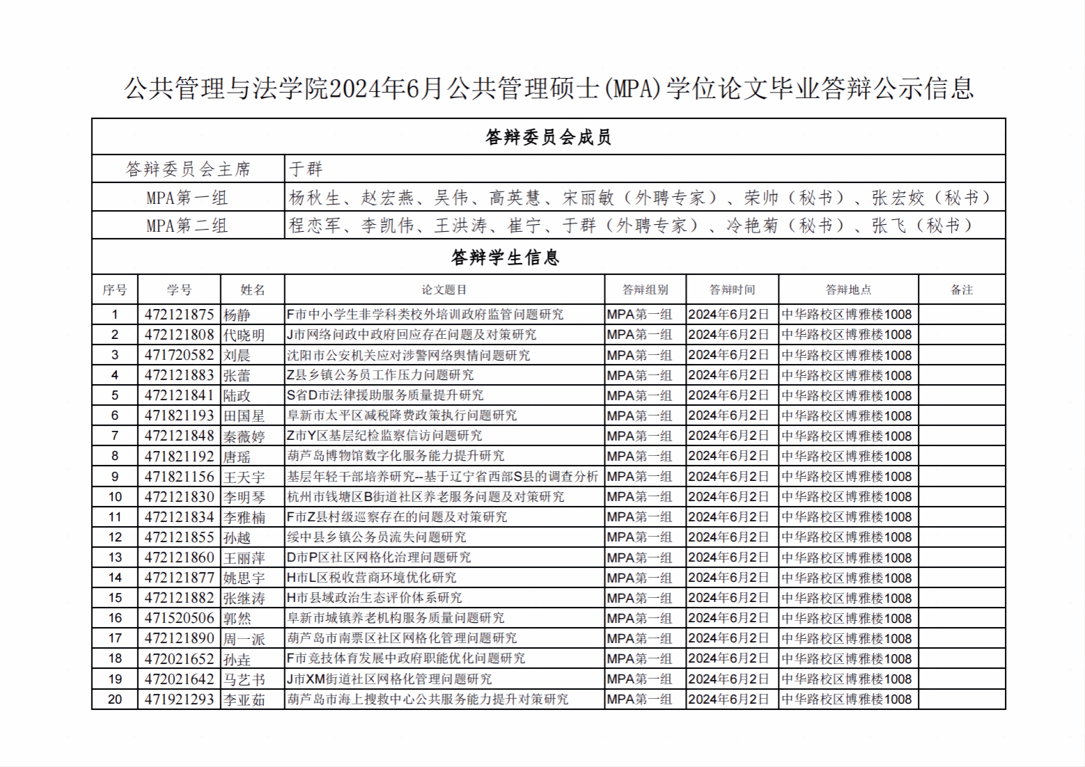 小奶猫直播 2024年6月公共管理硕士(MPA)学位论文毕业答辩公示信息