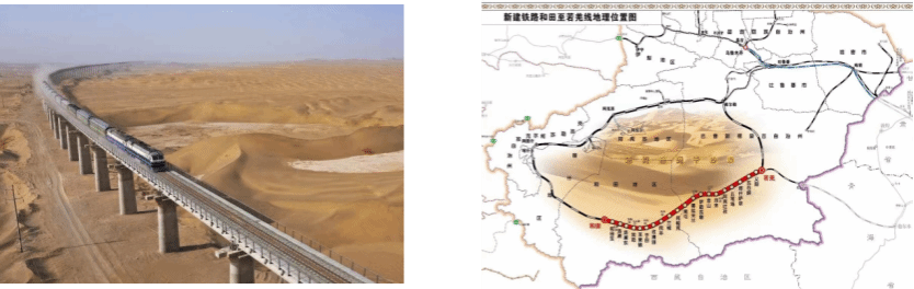 行至和田地区,在高速旁边的沙漠深处若隐若现看到有环形的铁路桥,那就是和若铁路。2022年6月16日,随着和若铁路正式运营,世界首条沙漠铁路环线——环塔克拉玛干沙漠铁路,全线贯通。环塔克拉玛干沙漠铁路全长2712公里,沿线干旱缺水、昼夜温差大、季风时间长,沙尘暴和流沙时有发生,工程建设极具挑战。建设工程中,坚持工程防沙和植物防沙相结合,建成总长49.7公里的过沙桥5座,高立式阻沙屏障1542公里。它的建成通车,彰显了我国铁路建设的综合实力,结束了且末、民丰等南疆5个县不通火车的历史,南疆有了通往我国西北、西南地区以及联通中亚、西亚的便捷运输大通道,使人民出行更为便利,水果、棉花等各类物资可通过铁路运往全国各地,对促进沿线经济社会发展,助力高质量共建“一带一路”具有重要意义。