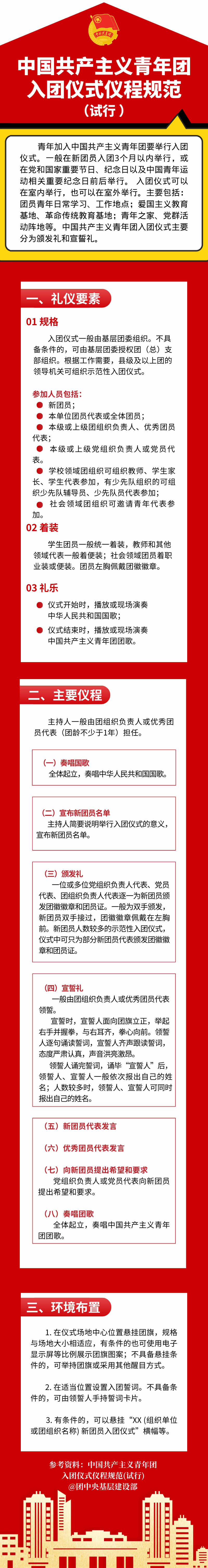 为全面贯彻习近平新时代中国特色社会主义思想,深入贯彻习近平总书记关于青年工作的重要思想,践行党、团、队一体化培养体系要求,帮助各级共青团组织规范开展仪式教育,共青团中央办公厅2023年12月25日发布了《中国共产主义青年团入团仪式仪程规范(试行)》。