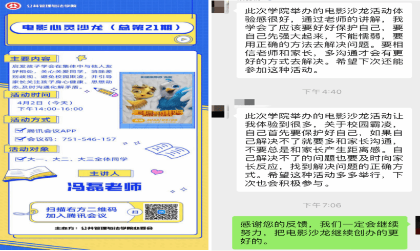 自2020年秋开始,将电影沙龙通过网络团体辅导的方式进行,截至2023年10月,共开展网络电影沙龙活动20次,先后播放了电影《催眠大师》《超能陆战队》《流浪地球》、 《飞屋环游记》《我和我的祖国》《回归》《夺冠》《厉害了,我的国》《遗愿清单》《幸福来敲门》《风雨哈弗路》等 优秀的电影,受到了学生的欢迎和喜爱。通过电影沙龙对学生进行理想信念教育、生命教育、挫折教育等,引导学生从电影中得到启发,锚定目标,调整行动。