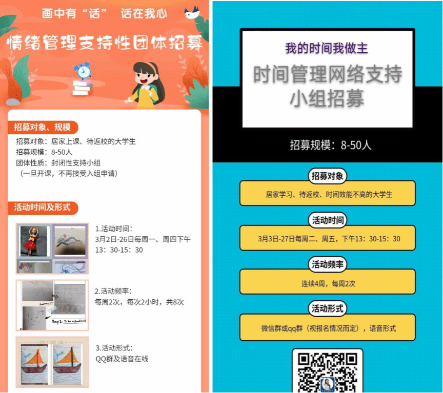 发挥网络的隐蔽性和开放性功能,激发学生潜在的心理需求显现化;发挥网络的延展性和便捷性功能,突破活动时间和空间的限制鼓励学生主动参与和体验;通过活动方案的设计共情学生的感受,协助学生解决心理困扰;通过团体性互动给予学生支持和建议,促进学生成长和改变,从而实现稳定情绪、提升心理健康水平、促进身心协调发展的工作目标。