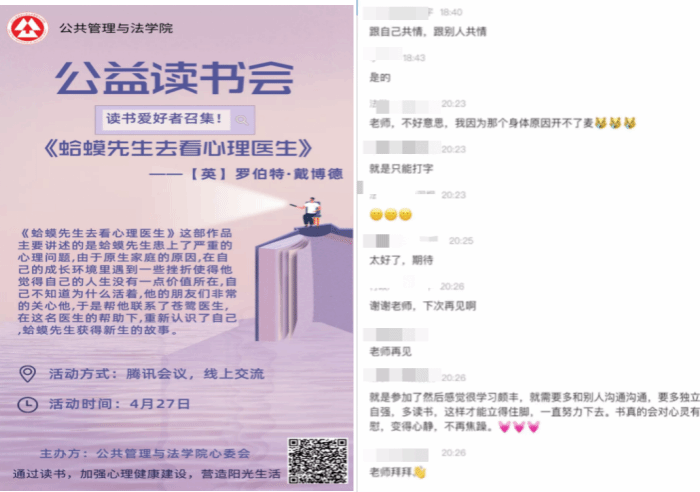共开设《蛤蟆先生去看心理医生》《我们仨》线上一次单元网络读书小组2期,对学生进行生命教育,宣传普及心理咨询的相关知识及自我成长的具体方法,有效满足了学生的好奇,稳定了学生情绪状态。