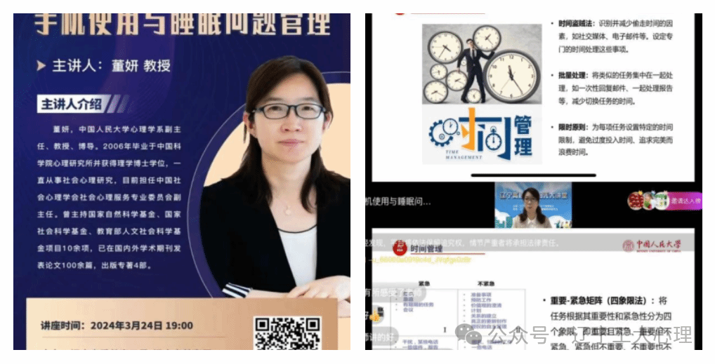 她指出了当下的数字化生活的特征,手机使我们认知局限,思维固化,信息过载的情况,并就此提出了番茄工作法、时间盗贼法、批量处理法等一系列解决方法;接着老师从多角度科普了睡眠的作用以及当我们遇到睡眠问题时的表现与影响;