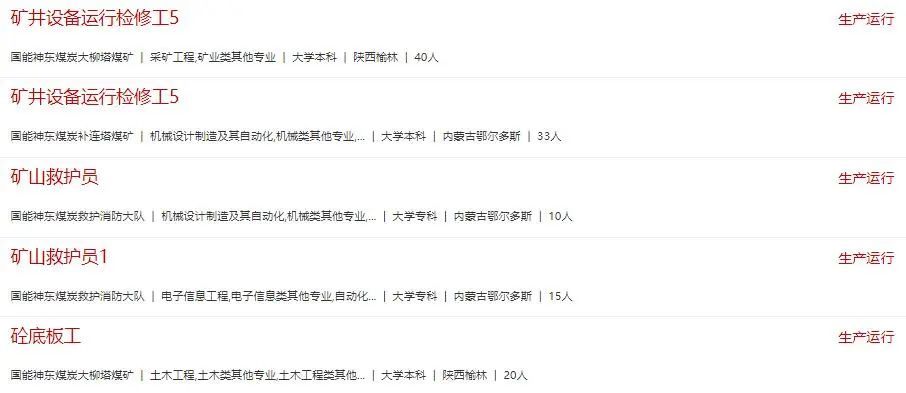 矿井设备运行检修工(机械类、机械工程类、机械设计制造类、机电设备类、电气类、自动化类、电气工程类、地质类、资源勘查类、测绘地理信息类、煤炭类、安全工程与科学类、矿业类、电子信息类、计算机类)、地质防治水工(地质类)、砼底板工(土木类、土木工程类)、矿山救护员(机械类、矿业类、电子信息类、自动化类、公安技术类)、智能运维工(计算机类)